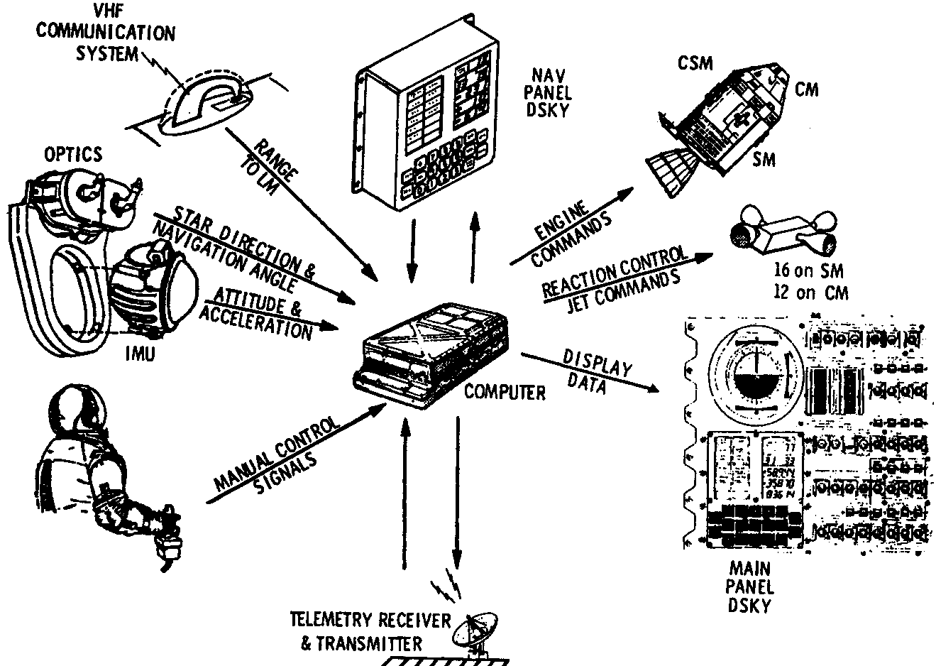 Aus der Abbildung ist auch ersichtlich, dass die manuelle Steuerung ebenfalls über den AGC läuft und somit keineswegs unabhängig vom Computer ist. Die Architektur des AGC lässt sich in sieben Bereiche unterteilen: Zeitgeber (timer) - für Synchronisierungsimpulse Sequenzgenerator (sequence generator) - regelt die Ausführung der Maschineninstruktionen durch Steuerimpulse Zentralprozessor (central processor) - Berechnungen Speicher (memory) - aufgeteilt in Festspeicher und beschreibbaren Speicher