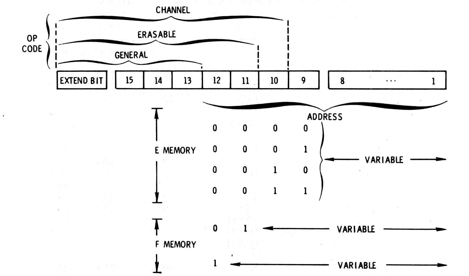 Vor einer dieser erweiterten Anweisungen musste also jeweils die EXTEND-Anweisung aufgerufen werden, was zusätzlichen Overhead bedeutete. Damit der Overhead nicht zu groß wurde, verteilten die Entwickler die einzelnen Instruktionen aufgrund deren Verwendungshäufigkeit zwischen den „normalen” und den „erweiterten” Anweisungen. Die obige Abbildung (aus „Journey to the Moon”) zeigt den Aufbau eines Befehlswortes im AGC (Block II) zur Nutzung solcher erweiterten Befehlssätze.
